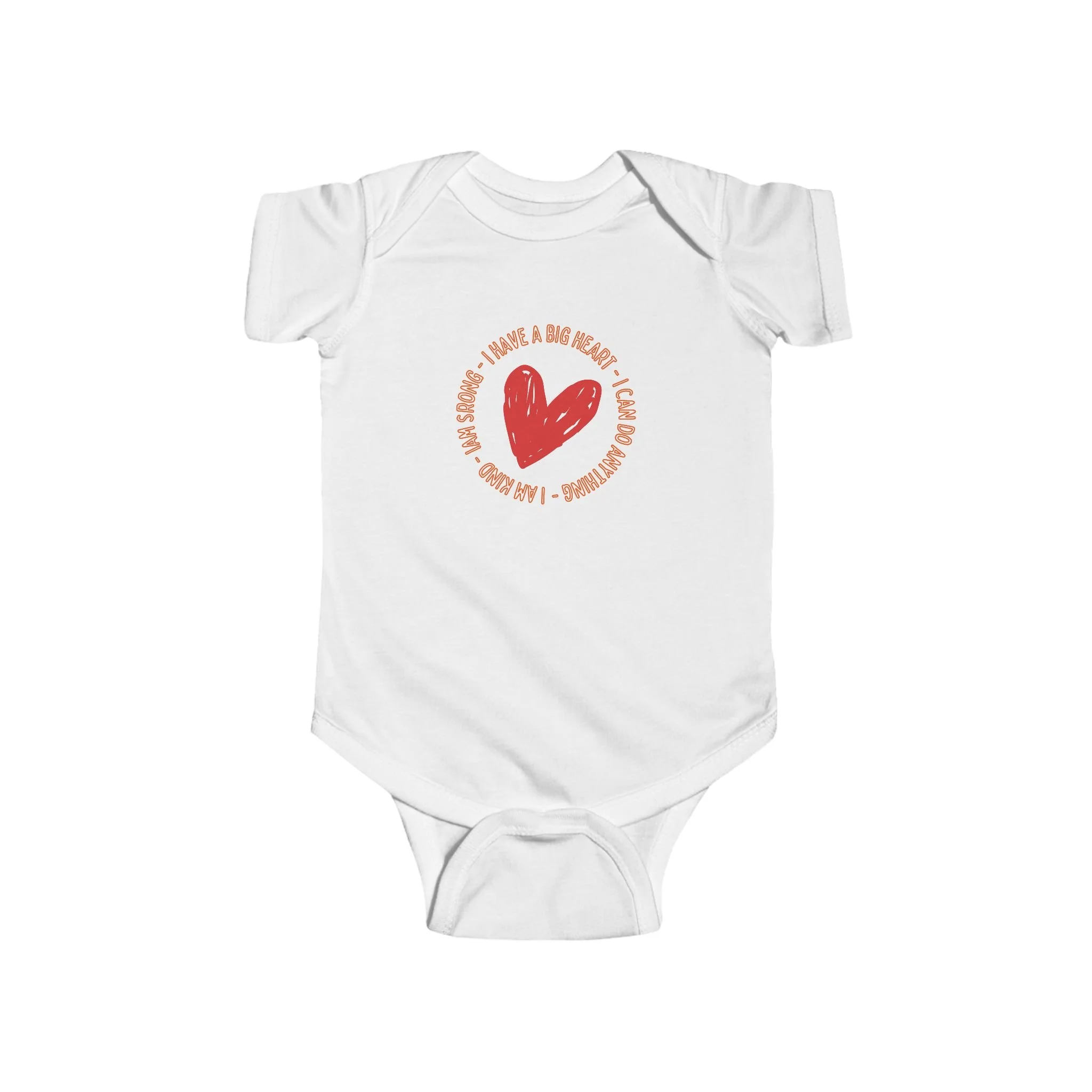 Soft and simple, this infant bodysuit brings a handcrafted touch to everyday baby wear. A warm, painterly heart sits at the chest, surrounded by a subtle circular script, giving the piece the gentle look of a keepsake onesie. Lightweight, breathable cotton keeps little ones comfortable through nap and play. Built with thoughtful details — ribbed neck for easy dressing, side seams for structure, and matching snaps at the crotch — it’s designed to move with busy babies and wash well after countless cuddles. The tear-away label and REACH-certified fibers add care-focused peace of mind for parents who want safe, durable basics with a bit of handmade charm.