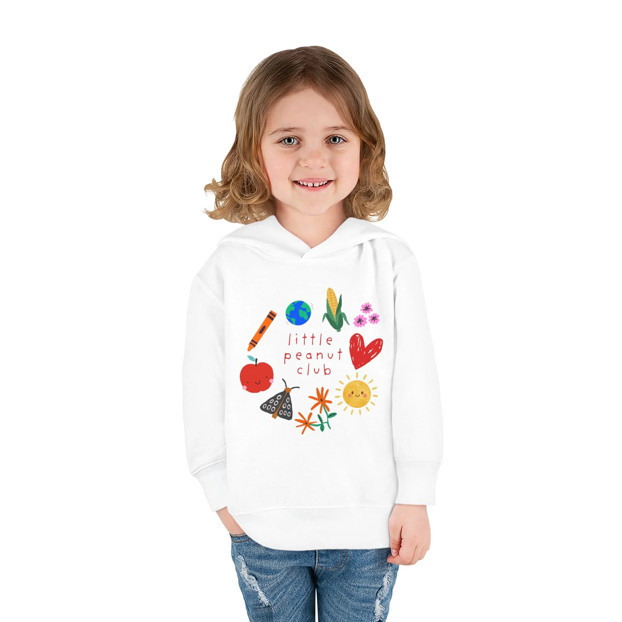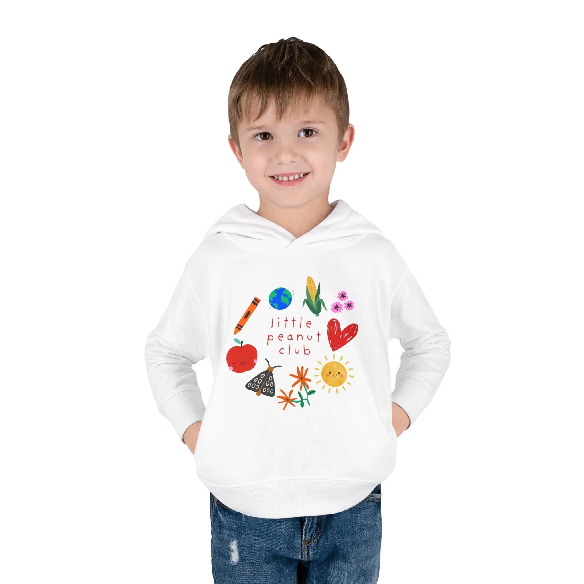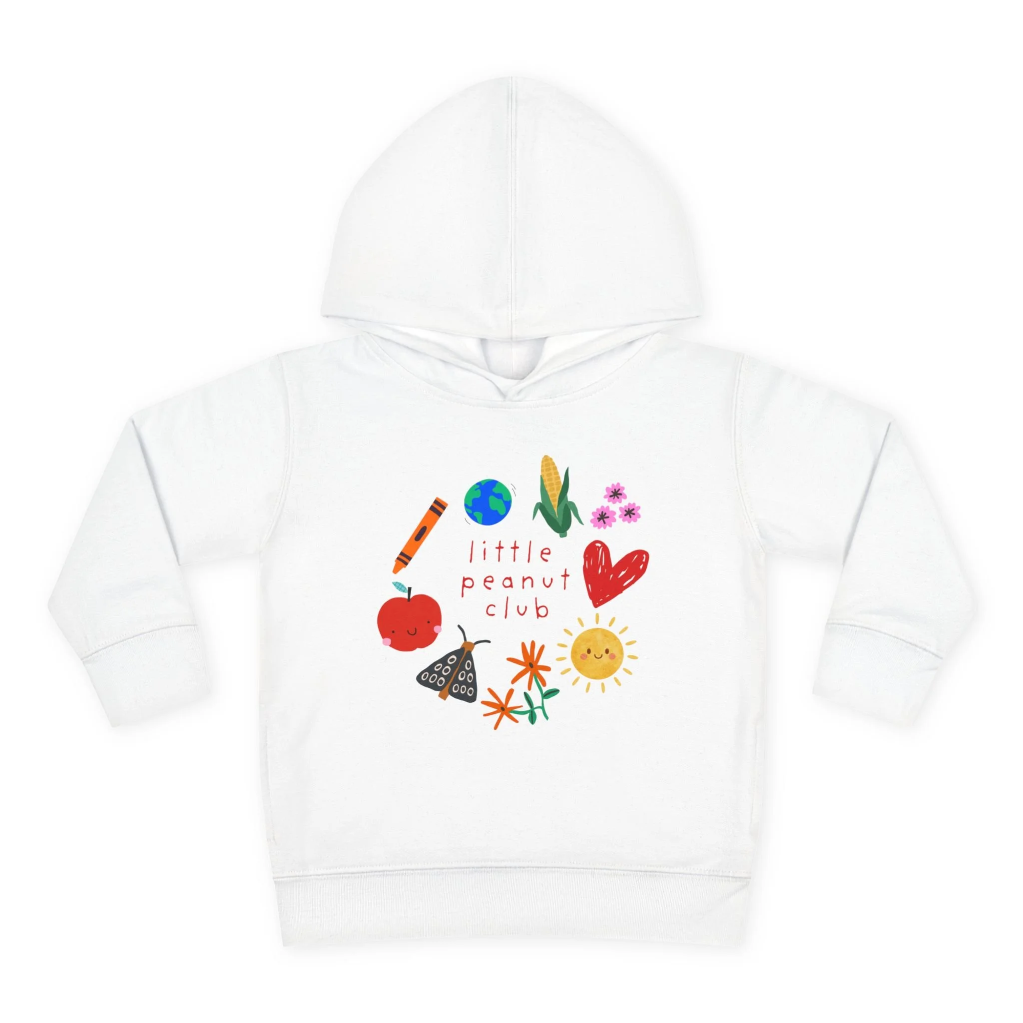 This cozy toddler pullover brings playful warmth to small adventures. Soft, brushed fabric hugs tiny shoulders while a gentle hood keeps ears warm during park runs or quiet story-time. Whimsical, hand-drawn icons form a cheerful circle on the chest — bright hearts, suns, little leaves and friendly doodles — that reads “little peanut club,” making the hoodie feel like a small badge of belonging. Side pockets hold tiny treasures. Durable stitch details and a lined hood stand up to everyday play and repeated washes. Light enough for layering under a coat, and comfy enough for nap time, it’s made to move with curious toddlers and to make caregivers smile.