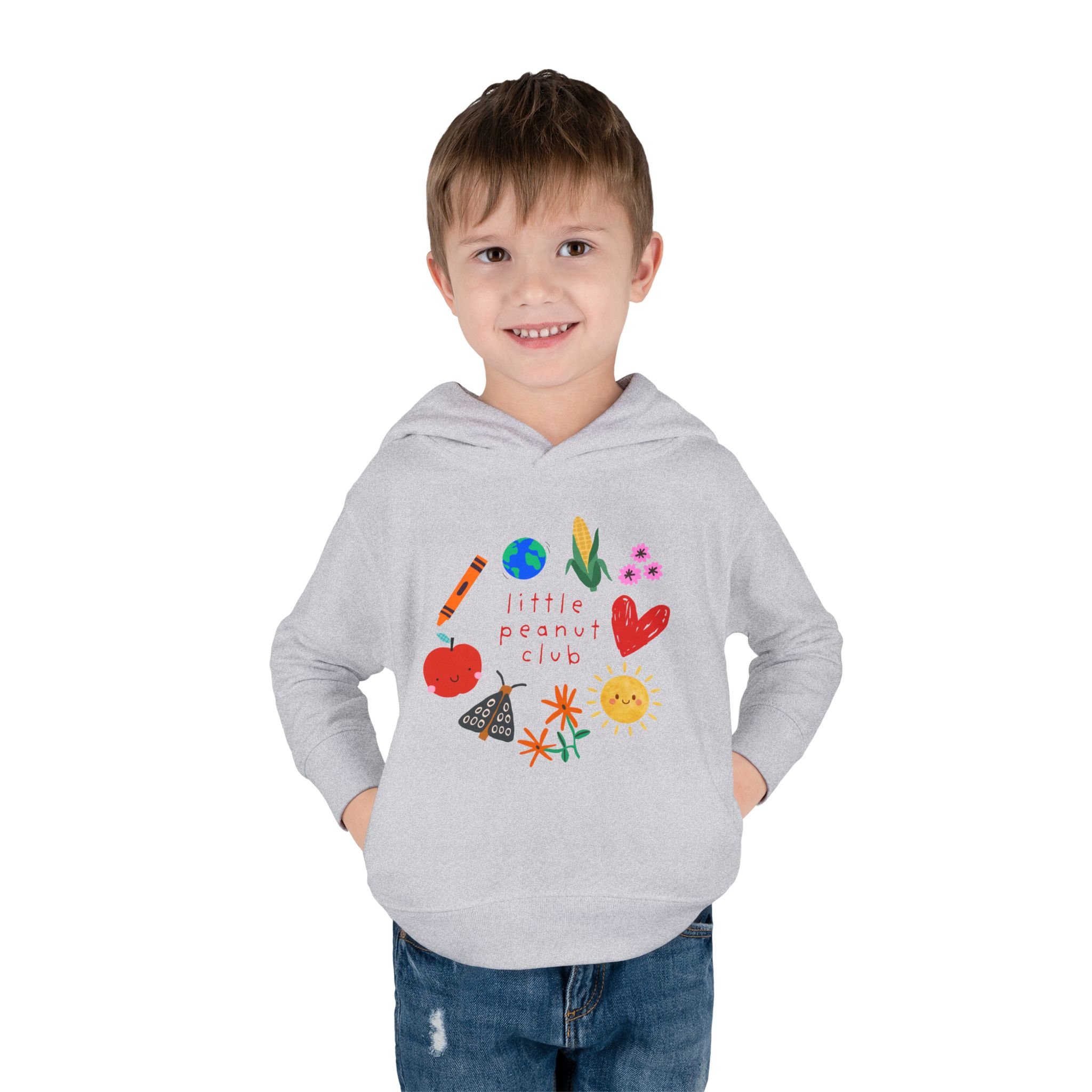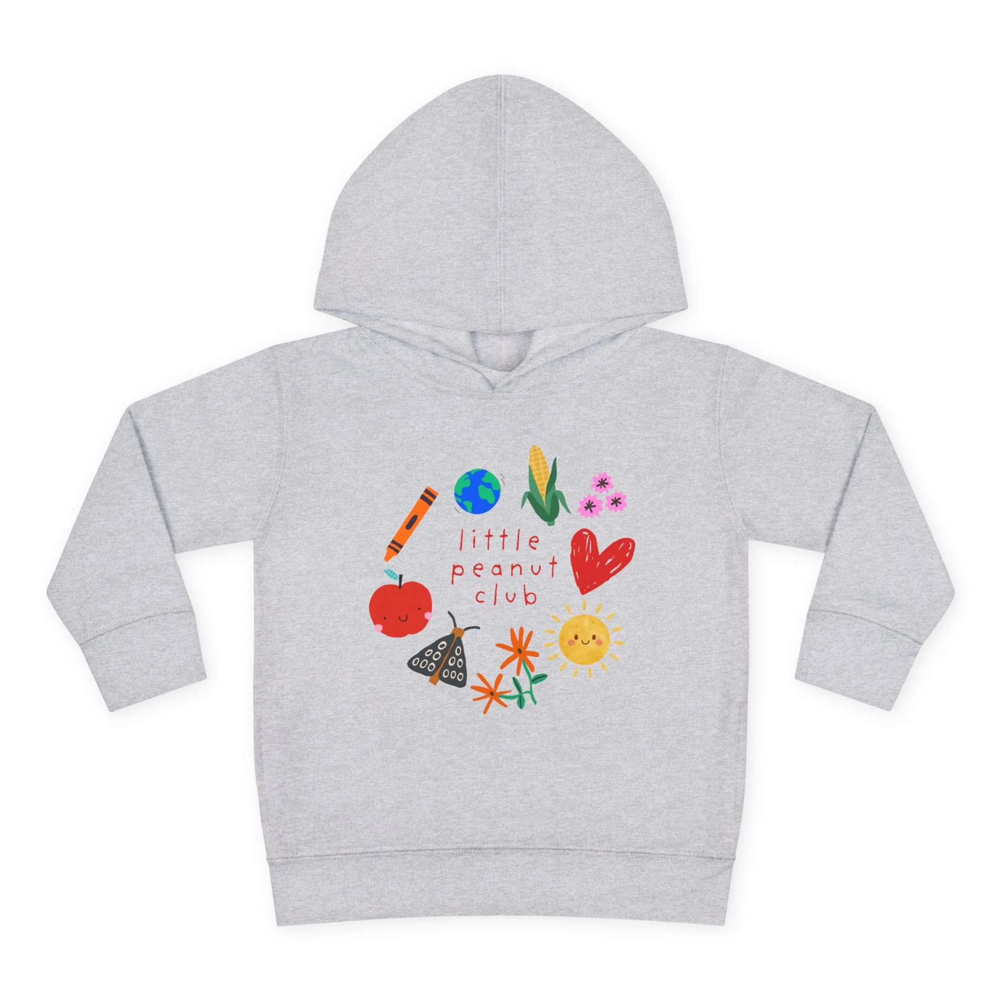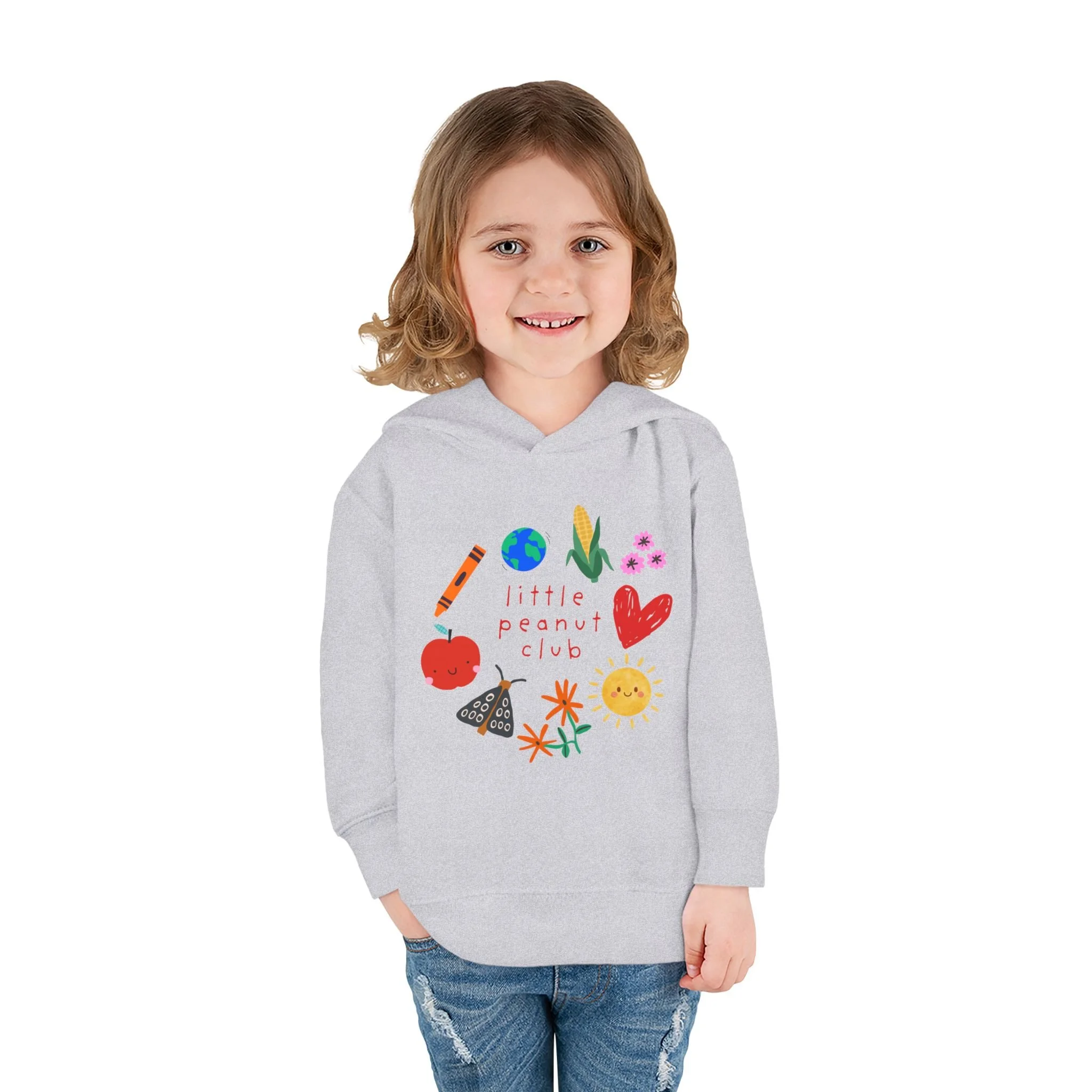 This cozy toddler pullover brings playful warmth to small adventures. Soft, brushed fabric hugs tiny shoulders while a gentle hood keeps ears warm during park runs or quiet story-time. Whimsical, hand-drawn icons form a cheerful circle on the chest — bright hearts, suns, little leaves and friendly doodles — that reads “little peanut club,” making the hoodie feel like a small badge of belonging. Side pockets hold tiny treasures. Durable stitch details and a lined hood stand up to everyday play and repeated washes. Light enough for layering under a coat, and comfy enough for nap time, it’s made to move with curious toddlers and to make caregivers smile.