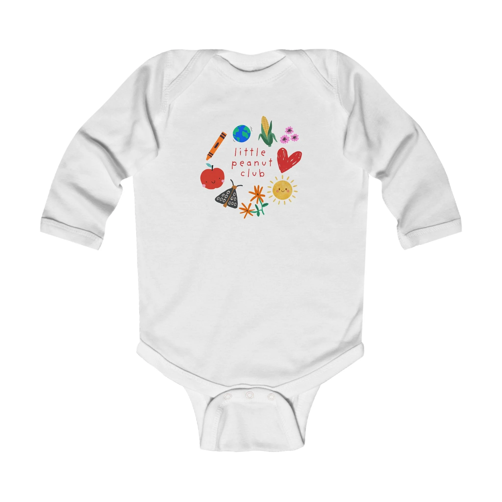 Soft, playful long-sleeve bodysuit designed for tiny explorers. A hand-drawn ring of colorful doodles—sun, heart, apple, pencil, leaf and tiny flowers—wraps gently around the sweet handwritten phrase “little peanut pal.” The lightweight cotton fabric and ribbed knit binding move with baby during feeding, napping, and curious wiggles. Snaps at the crotch make quick changes easy, while the tear-away label keeps skin comfy. This piece feels like a cozy morning in a bright, messy kitchen—sunlight on the floor, tiny crumbs, and a quiet, loving routine.