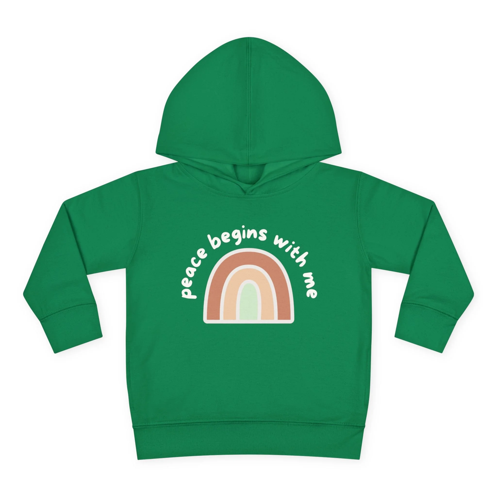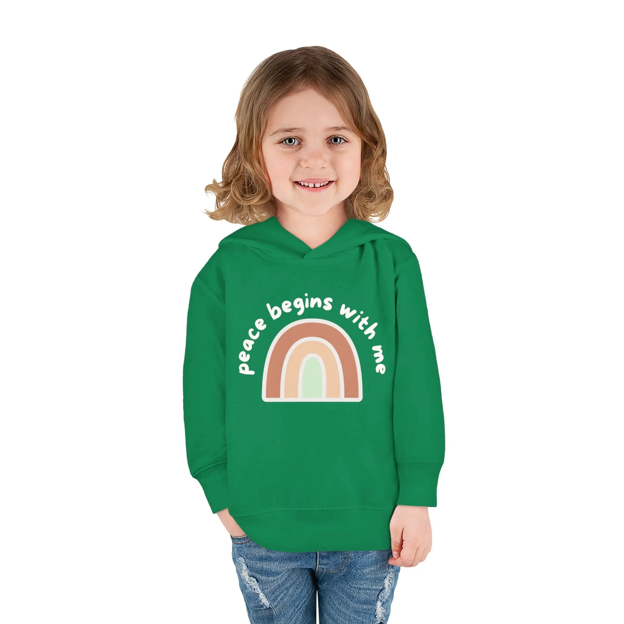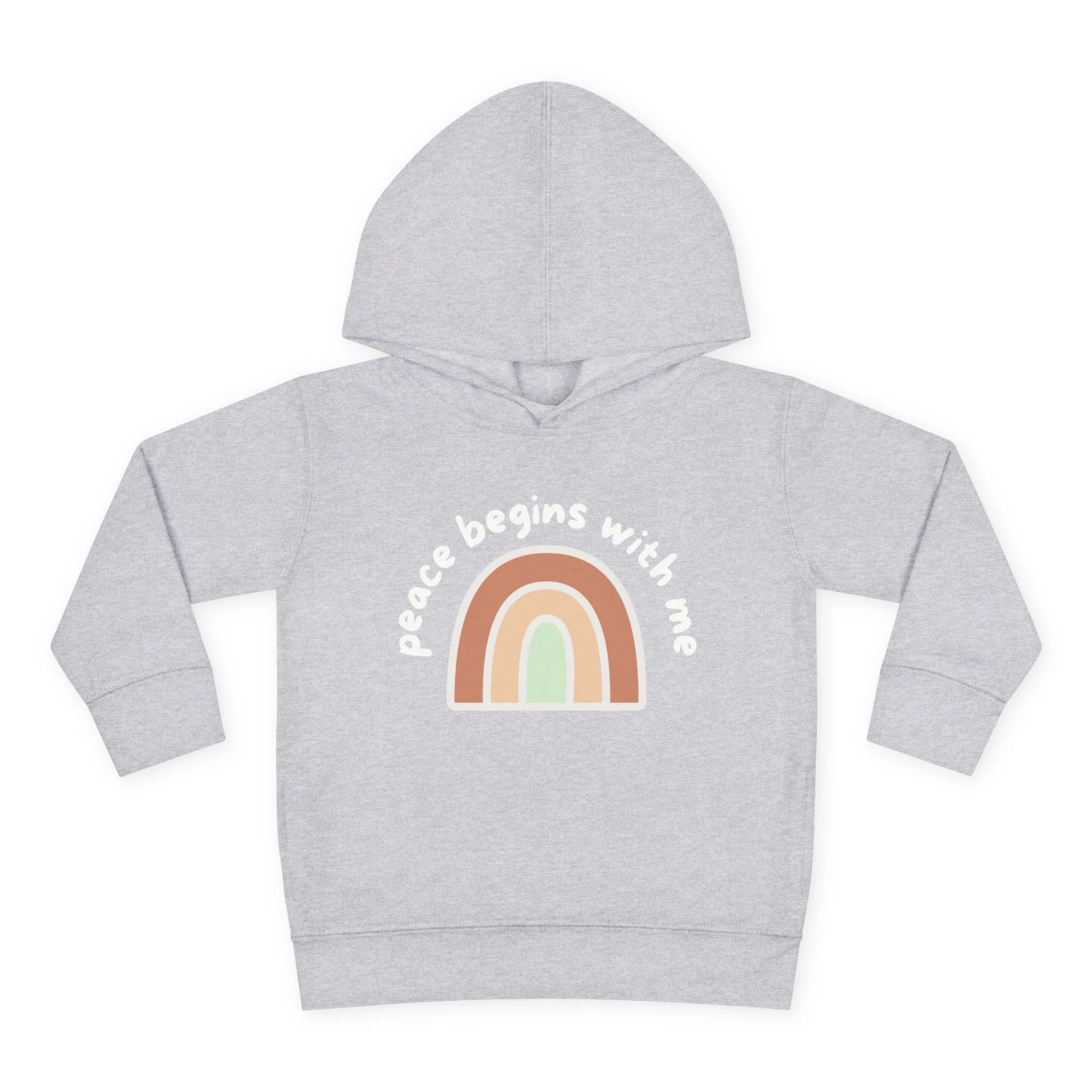 A cozy toddler pullover hoodie designed for little ones who love comfort and gentle style. Soft, medium-weight fleece wraps the child in warmth without bulk, while a jersey-lined hood and ribbed cuffs keep chilly drafts out during playground runs and nap-time cuddles. The front features a muted, friendly rainbow and the phrase “peace begins with me,” lending a calm, optimistic vibe that fits into quiet mornings at home or low-key family outings. Practical side-seam pockets hold tiny treasures, and durable coverstitching keeps the shape through washes and climbs. Subtle heather gray pairs easily with leggings or jeans for everyday wear.
