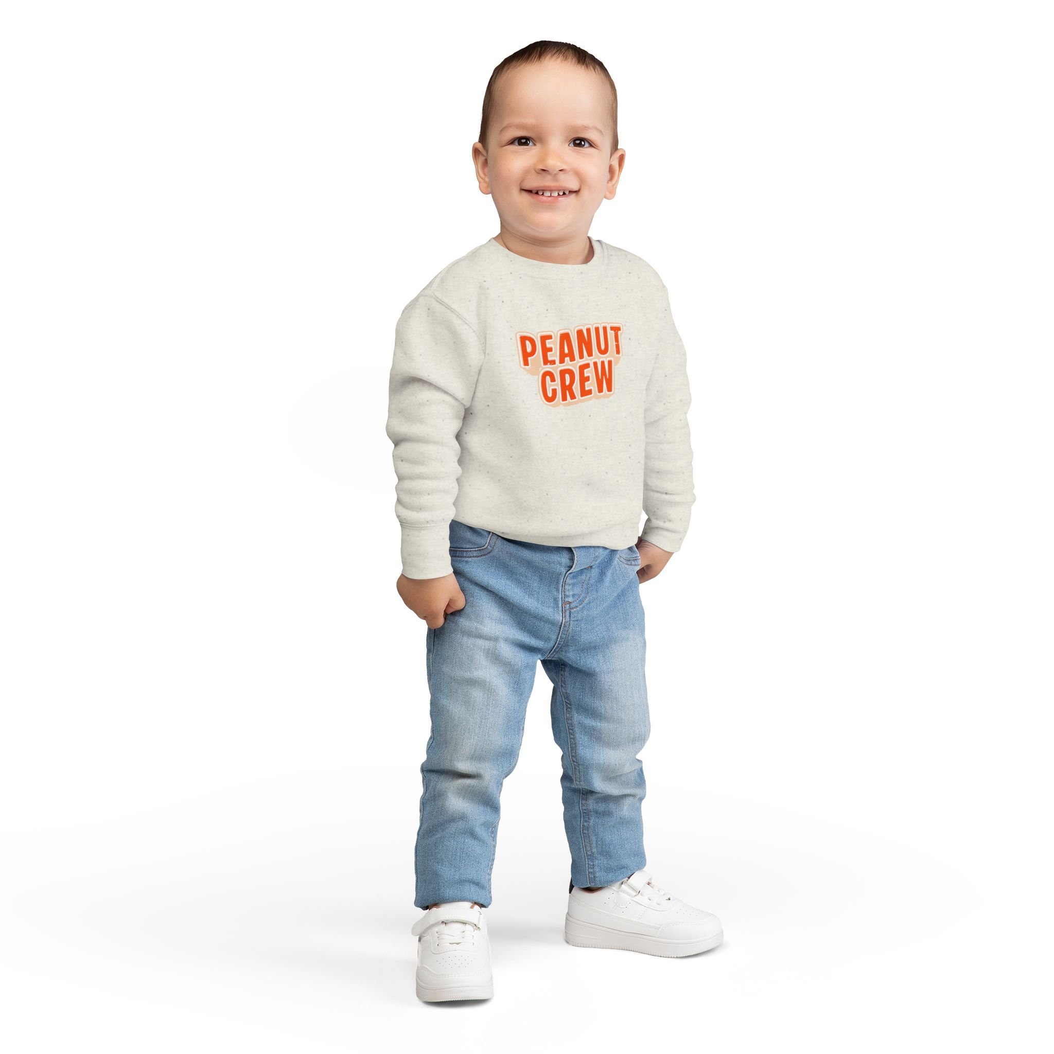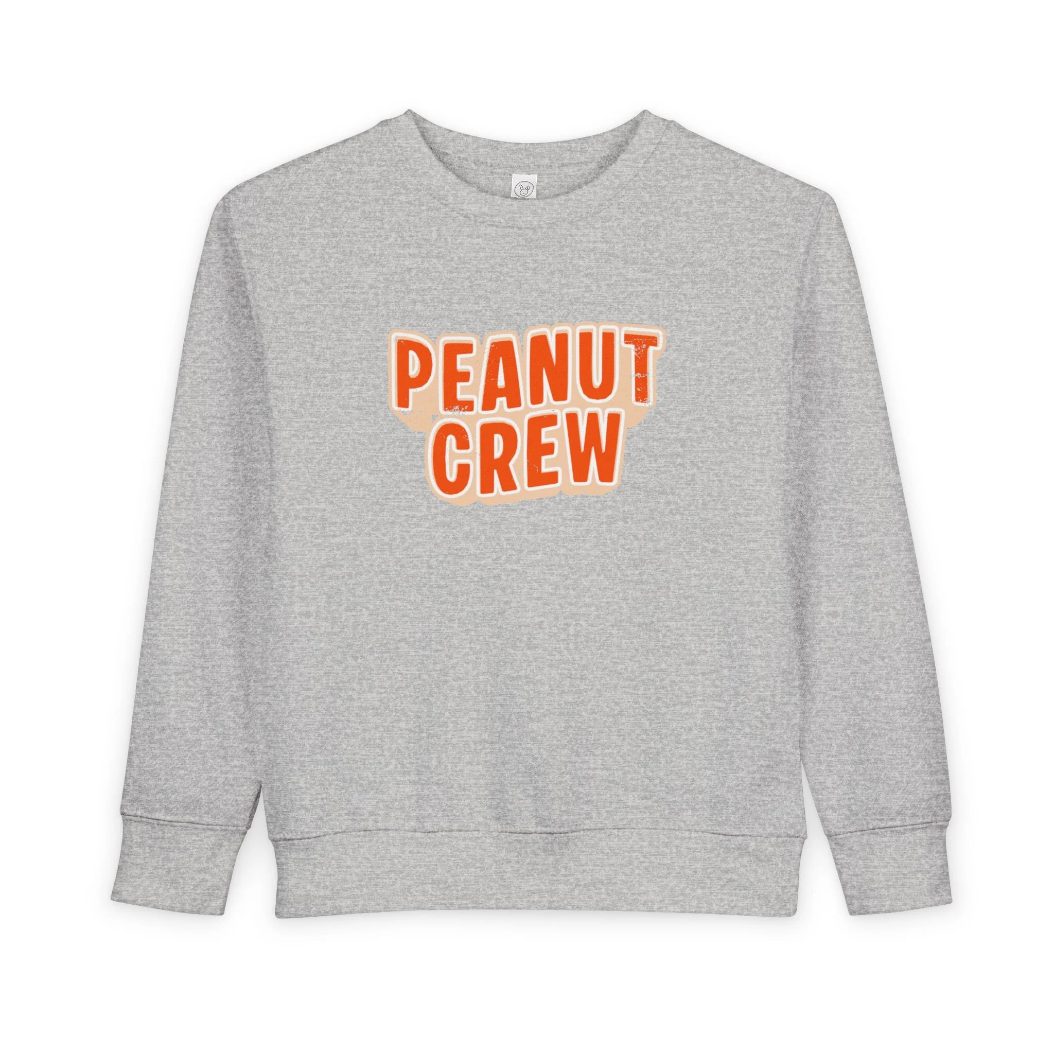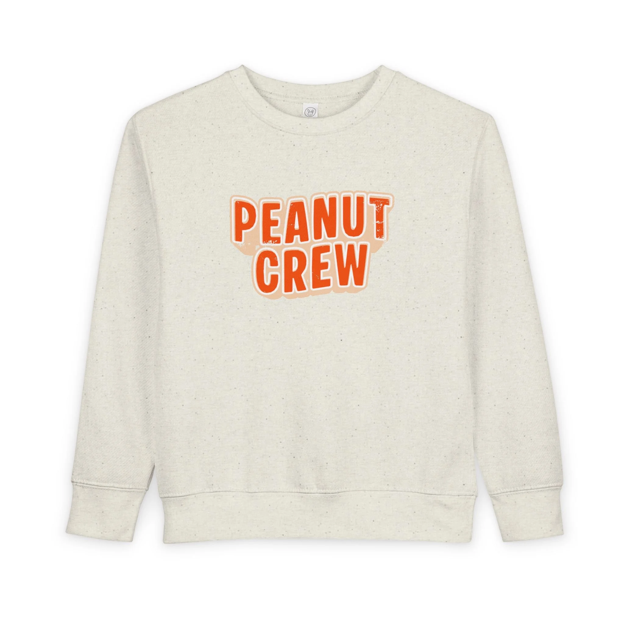 Soft, cozy, and playfully retro — this toddler sweatshirt wraps little ones in gentle warmth while celebrating their peanut-sized personalities. The speckled natural heather fabric and rounded, bold “PEANUT CREW” print sit like a sunny patch of fun on the chest. Lightweight yet warm, the medium-weight blend holds its shape through playtime and naps. Thoughtful details — ribbed cuffs and waistband, coverstitched seams, and a tear-away label — keep comfort front and center so kids can move freely and parents can breathe easy. Slip it on for chilly mornings at the park, family photos, or quiet couch days where tiny giggles and snack-time crumbs rule the world.