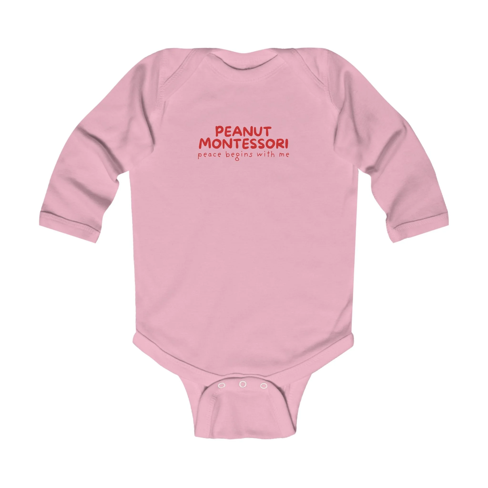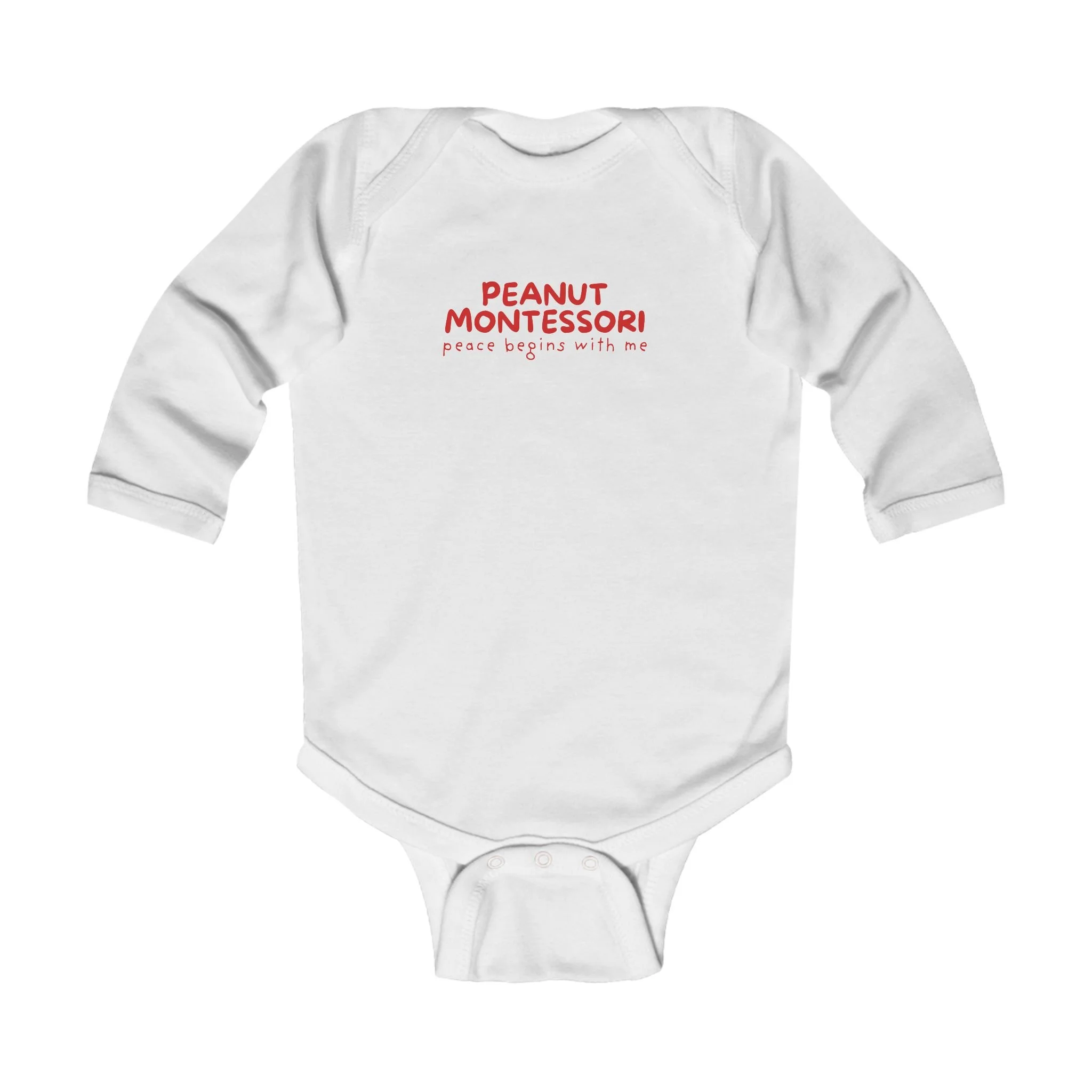 Soft, simple, and quietly confident — this long-sleeve infant bodysuit feels like a tiny classroom hug. The small, centered “Peanut Montessori” print sits near the chest, thoughtful and unfussy, so your little one can move, explore, and nap without distraction. Breathable, lightweight fabric keeps baby comfortable through quiet mornings and busy playtime. Gentle ribbed edges and three-snap closure make dressing easy and keep everything snug while still allowing freedom to wriggle. This is clothing that blends Montessori calm with everyday life: practical, understated, and made for curious little hands and steady caregivers.