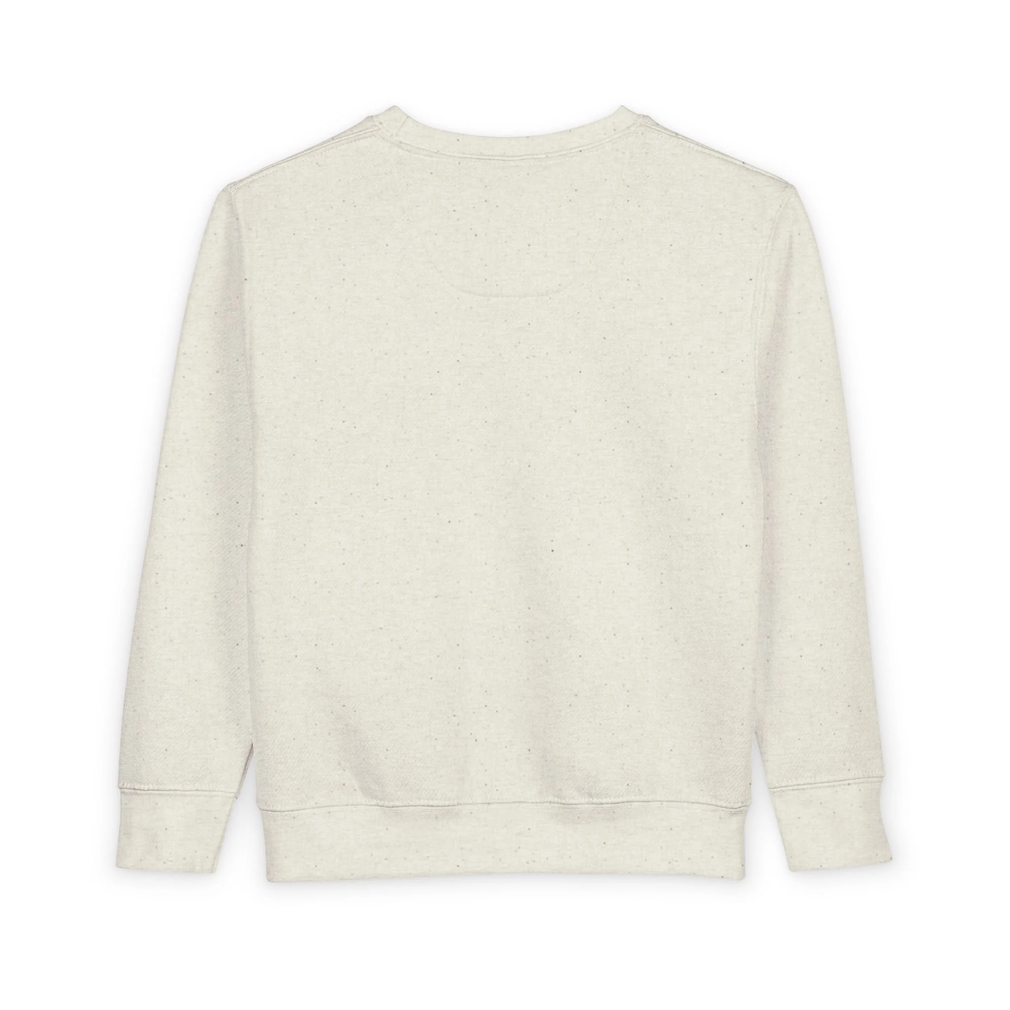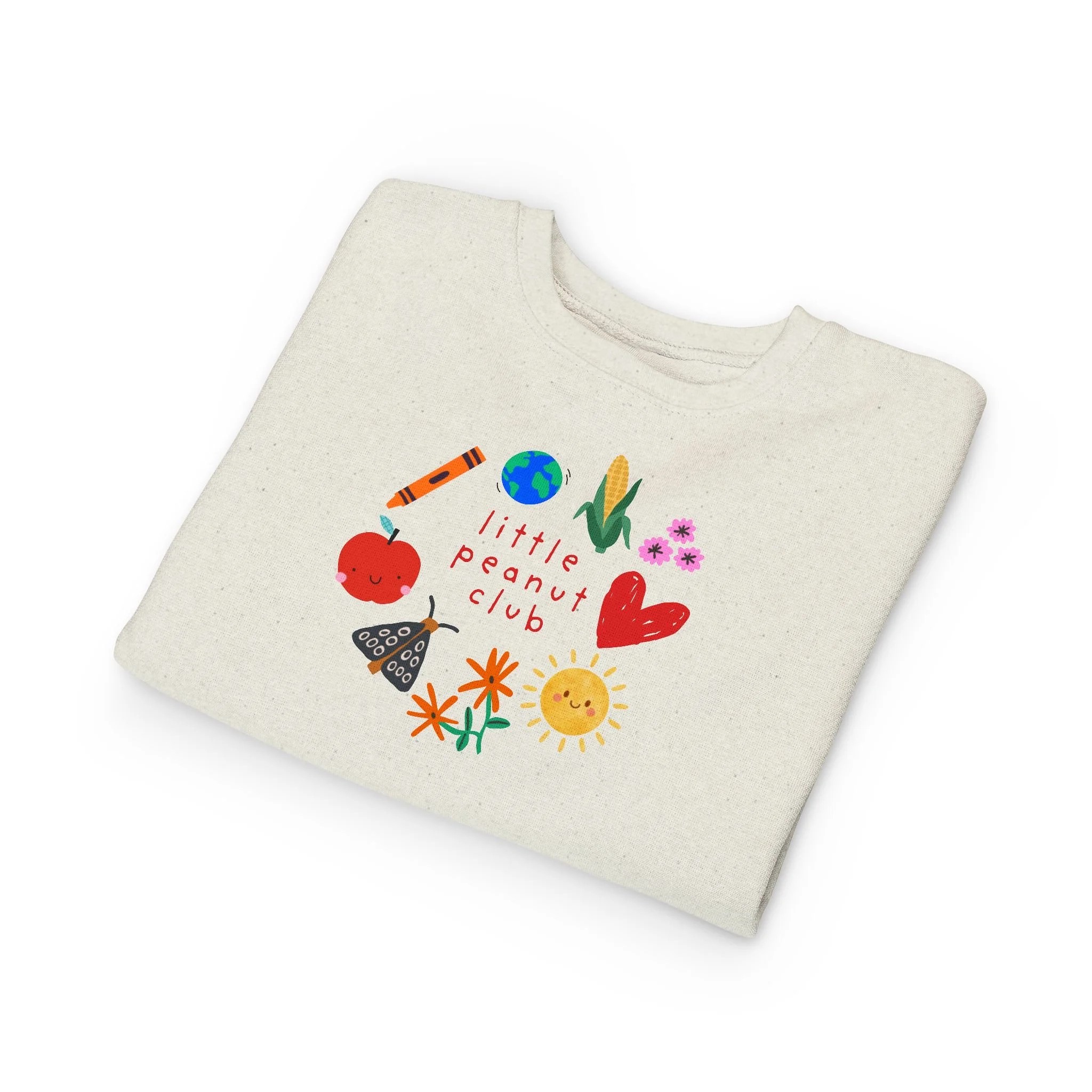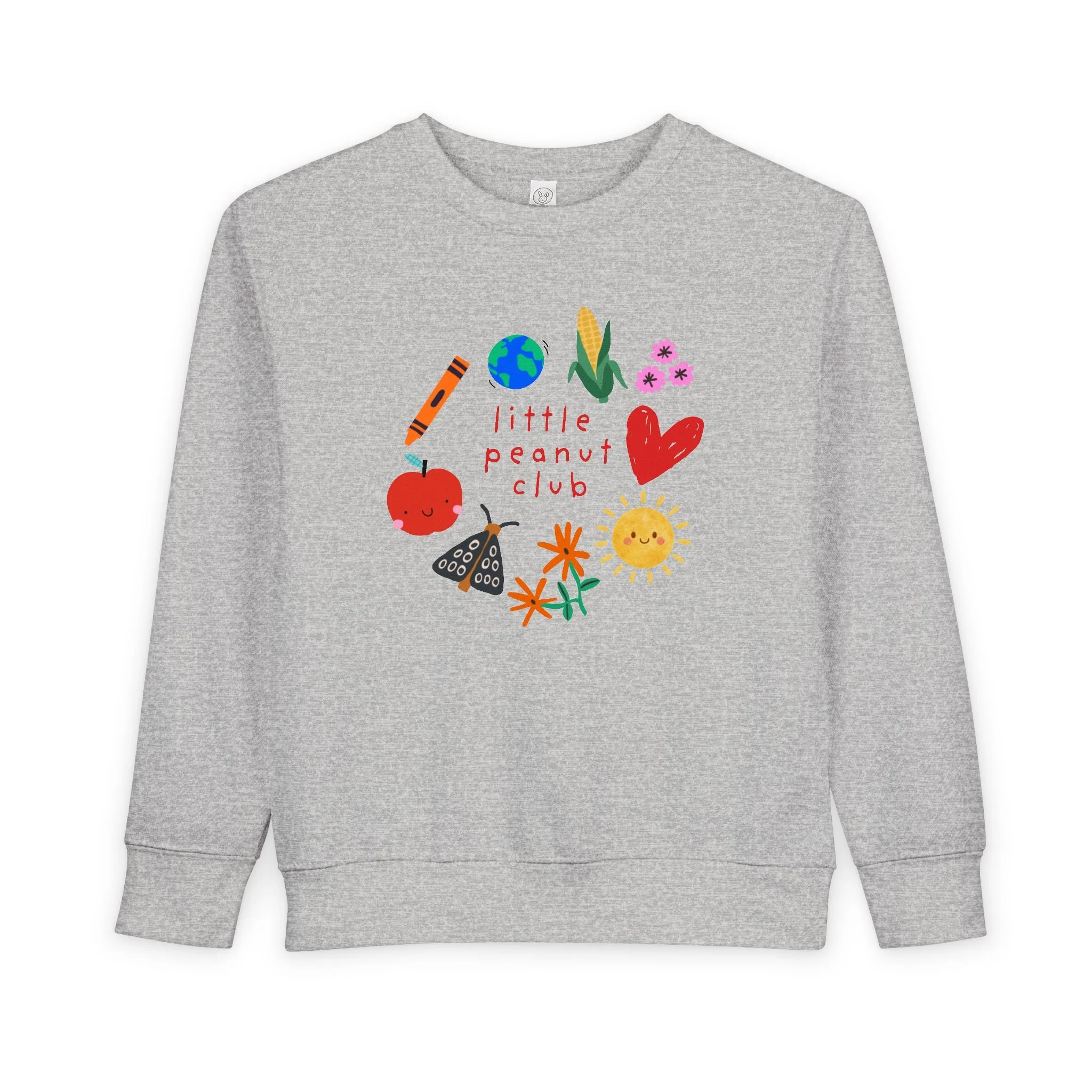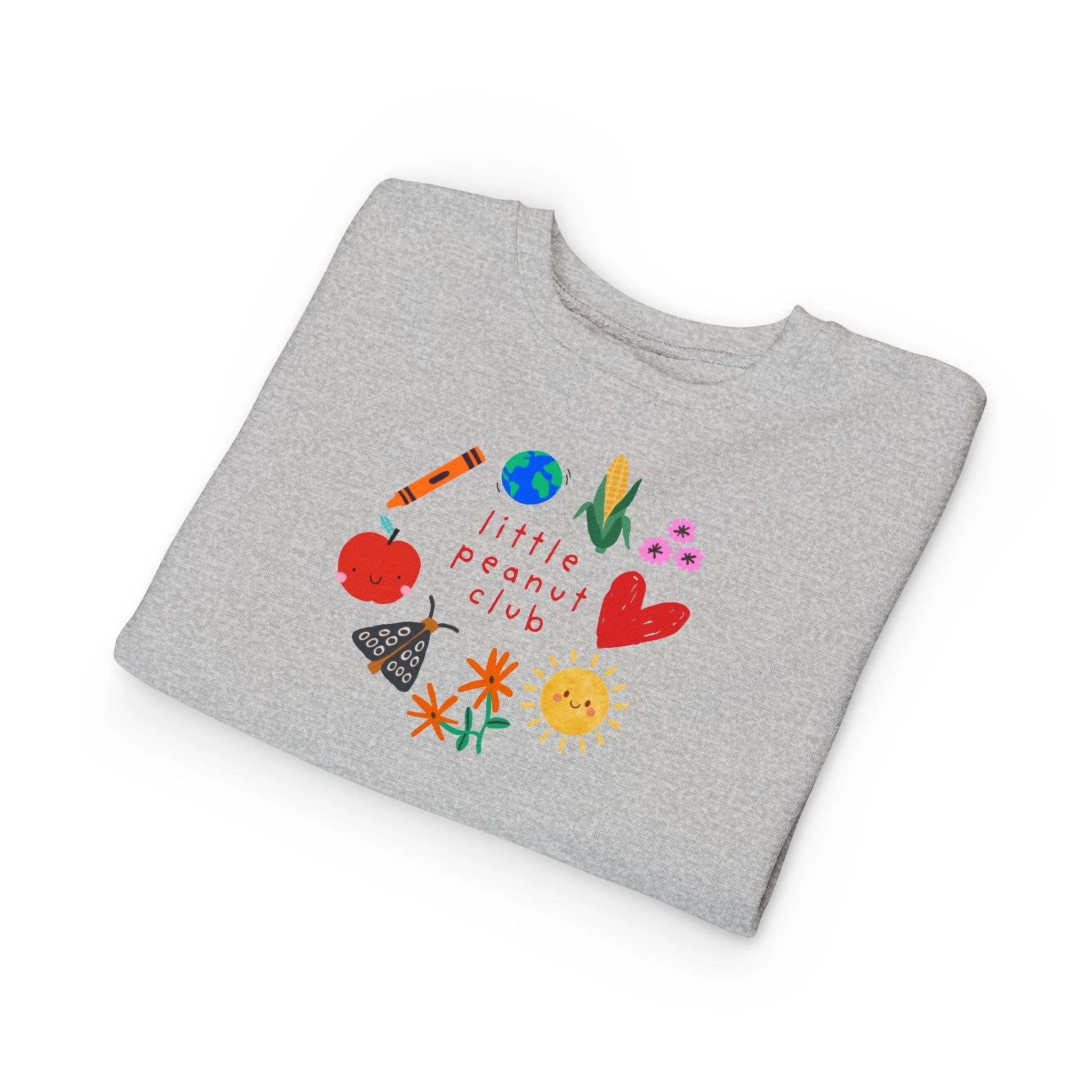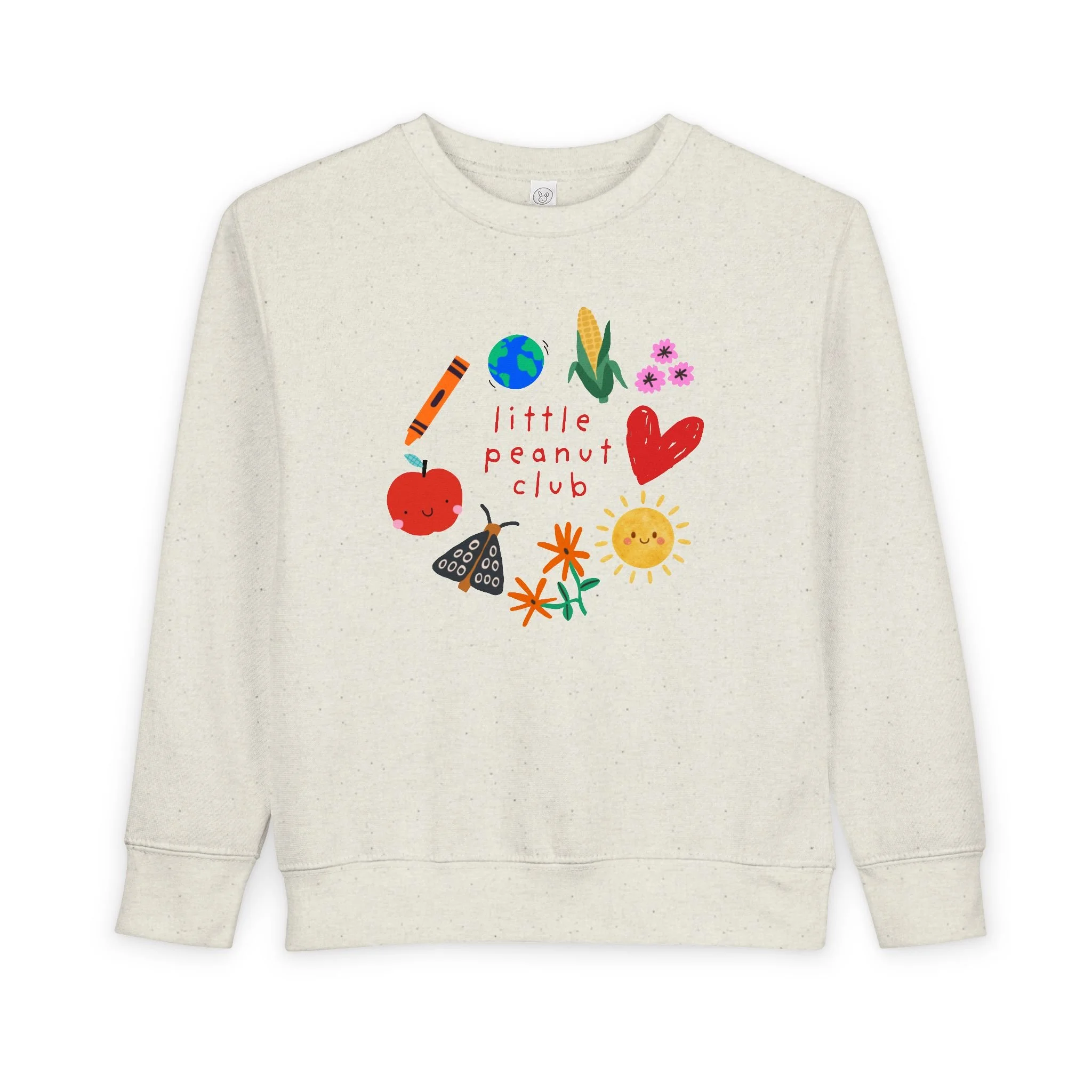 This cozy toddler sweatshirt brings a handful of sunny, hand-drawn charm to little wardrobes. Soft, slightly flecked fabric carries a playful cluster of doodled icons — a smiling sun, a red heart, an apple, a tiny globe, crayons and flowers — arranged around the words “little peanut club.” It feels like an afternoon of backyard play: warm, gentle, and full of small discoveries. The medium-weight cotton-poly blend holds its shape while staying soft on sensitive skin. Simple ribbed cuffs and a neat crewneck give it an easy, lived-in look that pairs with leggings, overalls, or favorite play pants. Dress them in this when you want comfort that looks like childhood itself — bright, curious, and unhurried.